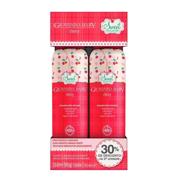 O Kit Desodorante Aerosol Antiperspirante Jato Seco Giovanna Baby Cherry é elaborado com ingredientes ativos que garantem total proteção contra os odores da transpiração, deixando um suave perfume e promovendo uma sensação de frescor o dia todo. A fórmula do desodorante aerosol Giovanna Baby é composta por agentes hidratantes para dar um toque de suavidade e maciez ao seu corpo.